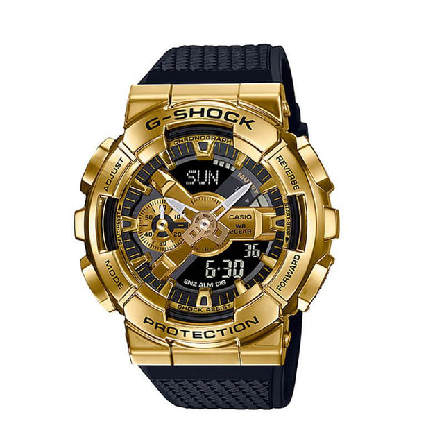 El G-Shock GM-110G-1A9 es una pieza imponente que fusiona diseño industrial, detalles dorados y resistencia extrema. Con su bisel metálico en tono dorado y su dial de gran tamaño, este reloj digital-análogo para hombre proyecta carácter y presencia desde cualquier ángulo.