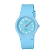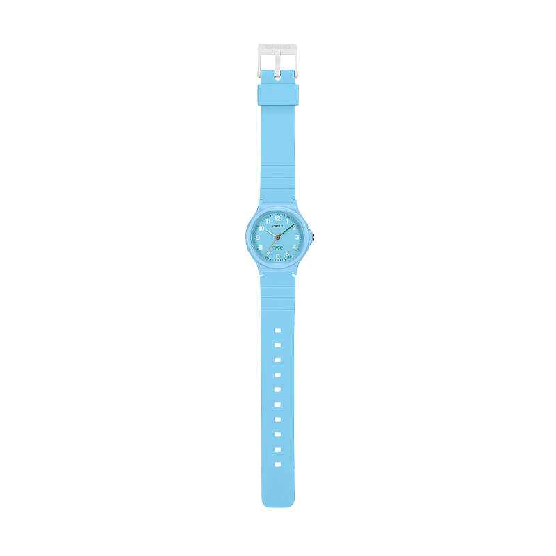 El Casio LQ-24B-2B presenta un diseño minimalista y juvenil con caja rectangular de resina en tono celeste claro. Su carátula celeste de estilo limpio, con marcadores blancos y agujas delgadas, aporta un contraste elegante y de fácil lectura. Su tamaño compacto y correa delgada en resina refuerzan una estética ligera y cómoda para el uso diario.