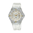 El Casio LRW-200HS-7EV luce un diseño deportivo y funcional con caja y correa de resina trasnparente, destacada por un bisel giratorio en tono a juego con detalles en dorado. Su carátula limpia, con marcadores contrastados y agujas luminosas, asegura una lectura clara incluso en ambientes de baja luz. De tamaño compacto, resulta ligero y cómodo en el uso diario.
