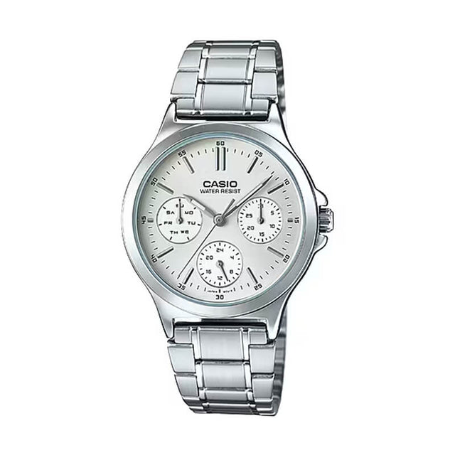 El reloj Casio LTP-V300D-7AUDF es una opción elegante y funcional diseñada para mujeres que aprecian la combinación de estilo clásico y durabilidad en un accesorio diario. Con su diseño sofisticado y su construcción robusta en acero inoxidable, este reloj no solo complementa una amplia variedad de atuendos, sino que también ofrece fiabilidad y precisión en cada momento.