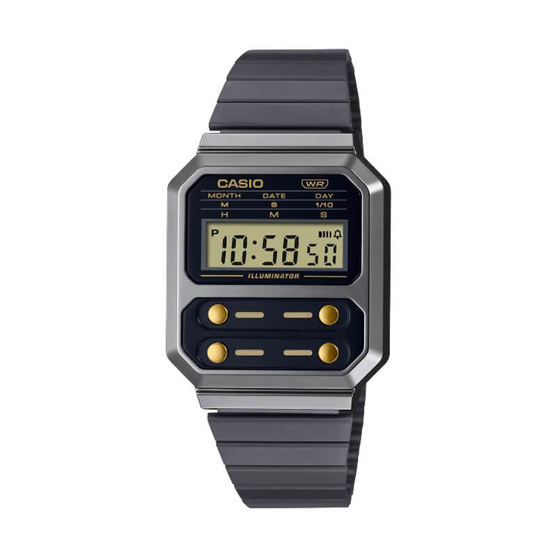 El Casio A100WEGG-1A2 reinterpreta un clásico de los años 70 con un acabado moderno y monocromático. Su caja de resina gris grafito y su correa de acero inoxidable tono gunmetal le dan un aire retro-futurista, mientras que los cuatro botones frontales refuerzan su estética vintage única.