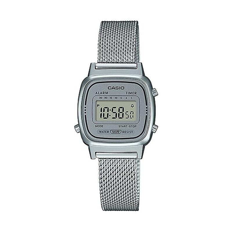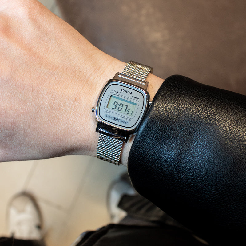 El Casio LA-670WEM-7 reinventa el clásico digital femenino con una estética refinada. Su caja plateada rectangular se combina con una correa de malla metálica ajustable, liviana y cómoda.