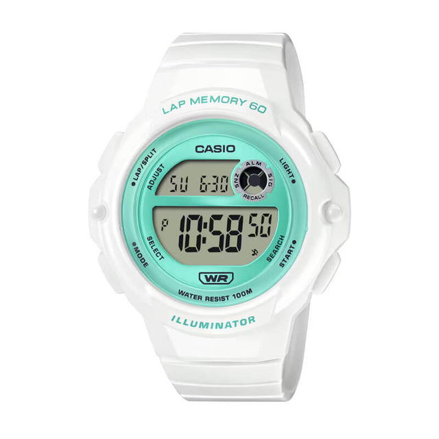 El Casio LWS-1200H-7A3VD presenta una caja de resina blanca con bisel gris y correa de resina ligera, creando un diseño deportivo y femenino. Su pantalla digital amplia con detalles en verde agua ofrece un estilo moderno y fresco, ideal para un look activo y casual.