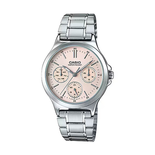 El reloj Casio LTP-V300D-4AUDF es un modelo elegante y sofisticado diseñado específicamente para mujeres que valoran tanto el estilo como la funcionalidad en sus accesorios. Con su diseño en tono rosado, este reloj combina bien con una amplia gama de atuendos, desde casual hasta más formal, proporcionando un toque de elegancia a cualquier ocasión.