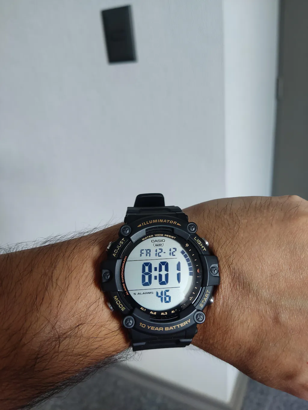 El Casio AE-1500WHX-1AV combina una caja de resina negra de gran tamaño con bisel robusto y correa de resina texturizada, logrando un estilo deportivo y funcional. Su amplia pantalla digital facilita la lectura y resalta con detalles en dorado que aportan un carácter distintivo.