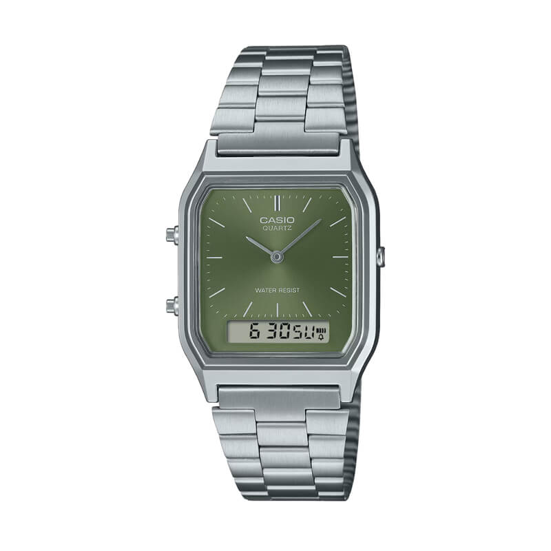 El Casio AQ-230A-3A presenta una caja rectangular plateada tipo Cartier Tank en resina cromada con brazalete de acero inoxidable, logrando un estilo clásico y refinado. Su carátula verde oscuro con pantalla digital inferior combina elegancia retro con funcionalidad moderna.
