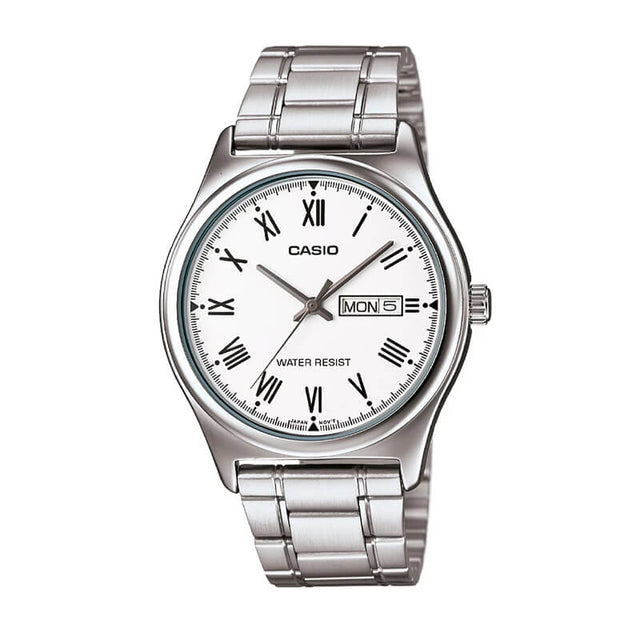 El Casio MTP-V006D-7B combina una caja de resina cromada plateada con brazalete de acero inoxidable, logrando un diseño clásico y distinguido. Su esfera blanca incorpora números romanos negros y doble calendario (día y fecha) a las 3, evocando la tradición de los relojes de vestir más elegantes.