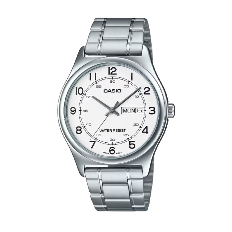 El Casio MTP-V006D-7B2 combina una caja de resina cromada plateada con brazalete de acero inoxidable, logrando un diseño clásico y elegante. Su esfera blanca incorpora índices arábigos en negro y un discreto bisel liso, evocando un estilo tradicional refinado con gran legibilidad.