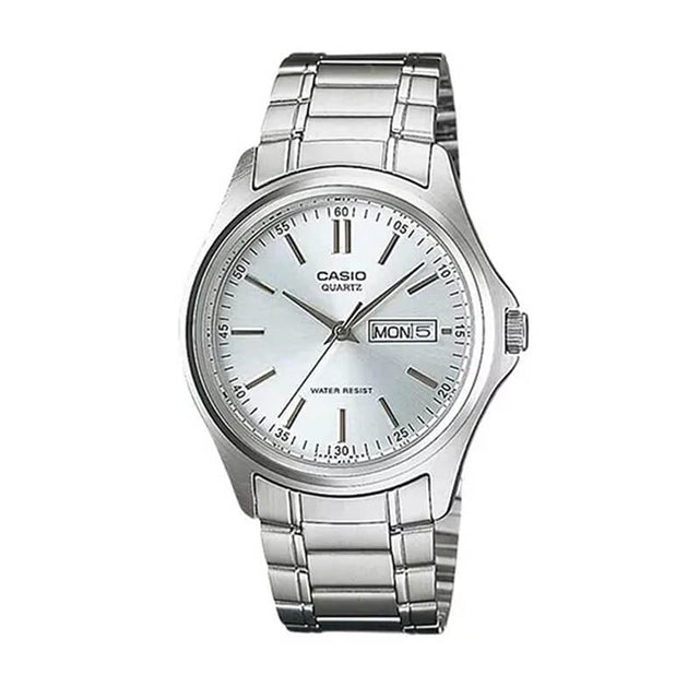 El Casio MTP-1239D-7A combina una caja de resina cromada plateada con brazalete de acero inoxidable, ofreciendo un diseño clásico y práctico. Su esfera plateada, con índices claros, números arábigos parciales y calendario a las 3, garantiza una lectura sencilla y elegante.