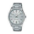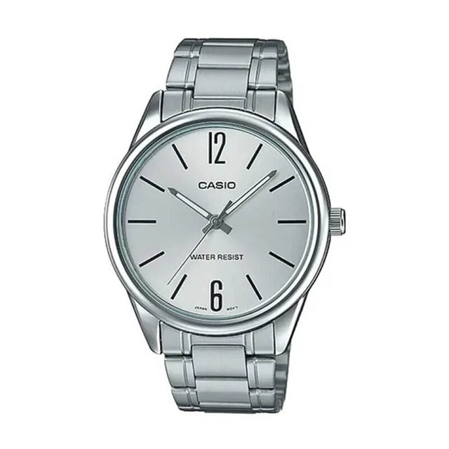 El Casio MTP-V005D-7BUDF combina una caja de resina cromada con acabado metálico y un brazalete de acero inoxidable de eslabones, ofreciendo un diseño elegante y resistente. Su carátula plateada con marcadores en tono plateado aporta sobriedad y claridad, manteniendo una estética clásica y versátil.