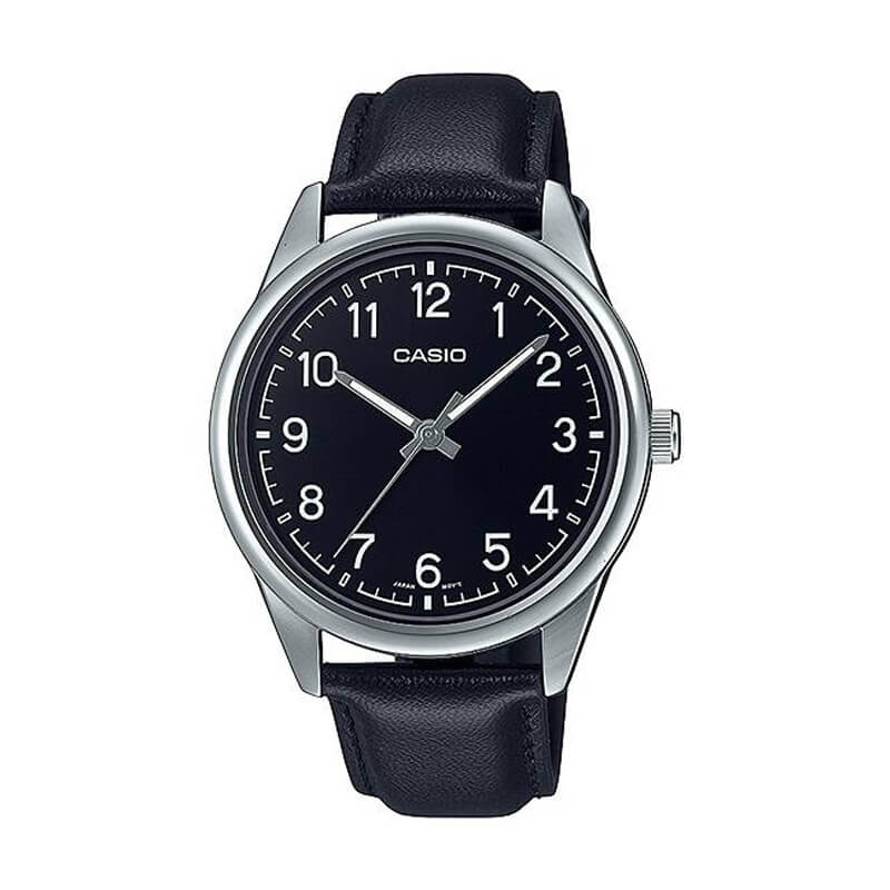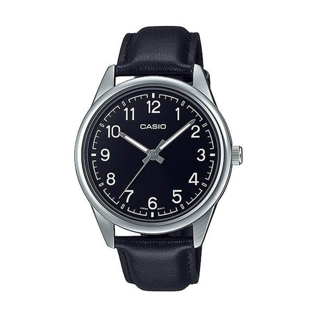 El Casio MTP-V005L-1B4UD combina una caja de resina cromada con acabado metálico y una correa de cuero negro texturizado, transmitiendo un estilo clásico y sobrio. Su carátula negra con marcadores blancos aporta un contraste elegante que realza su diseño tradicional.