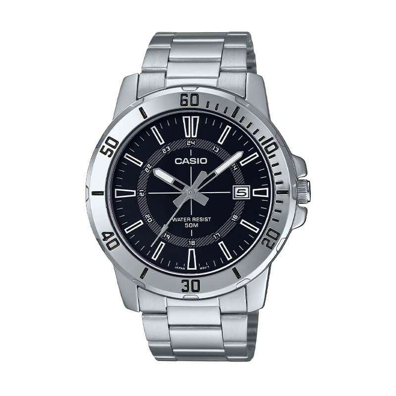 El Casio MTP-VD01D-1CVUD combina una caja de acero inoxidable con brazalete metálico de eslabones y una carátula negra clásica, resaltada con marcadores y agujas en contraste. Su diseño de 44 mm transmite solidez y estilo masculino, manteniendo una línea moderna y sobria.