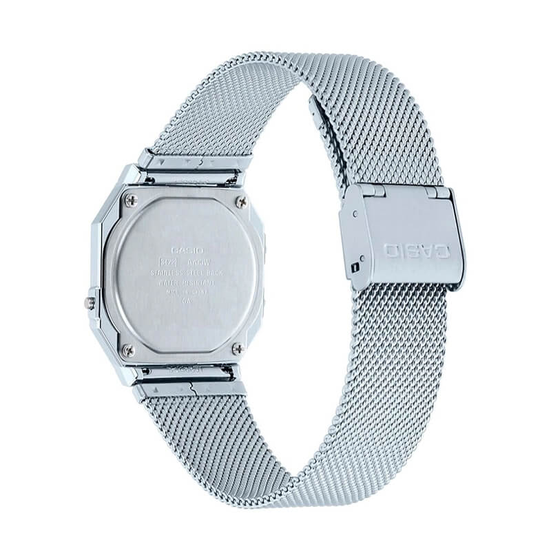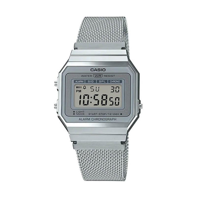 El Casio A-700WM-7A es un reloj digital que se distingue por su diseño elegante y moderno en color plateado. Su caja y correa de acero inoxidable le confieren un aspecto sofisticado, ideal para quienes buscan un reloj con un toque de clase y funcionalidad. Equipado con una pantalla LCD retroiluminada, este reloj ofrece una lectura clara en diferentes condiciones de luz.