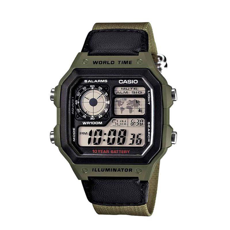 El Casio AE-1200WHB-3BV destaca por su diseño tipo "Commander" con caja de resina negra y correa textil verde oliva, ideal para un look utilitario. Su pantalla digital muestra hora mundial con mapa, hora dual, cronómetro, temporizador, 5 alarmas y calendario automático. Incluye luz LED y batería de 10 años. Resistente al agua hasta 100 metros, es perfecto para uso diario, viajes o actividades al aire libre con un estilo táctico y funcional.