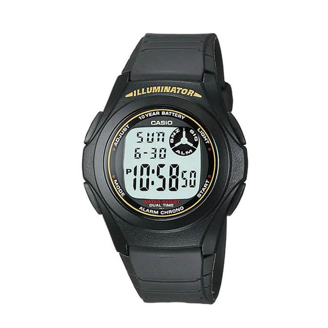 El Casio F-200W-9A es un reloj digital práctico y liviano con un diseño clásico y pantalla amplia de fácil lectura. Su caja de resina negra con detalles dorados ofrece un look sobrio y funcional. Incluye hora dual, cronómetro, alarma diaria, calendario automático y luz LED. Su correa de resina flexible brinda comodidad durante todo el día. Resistente al agua, es ideal para quienes buscan un reloj confiable, sin complicaciones y con estilo atemporal.