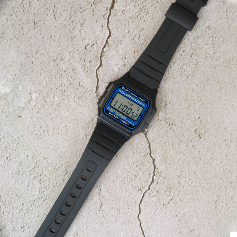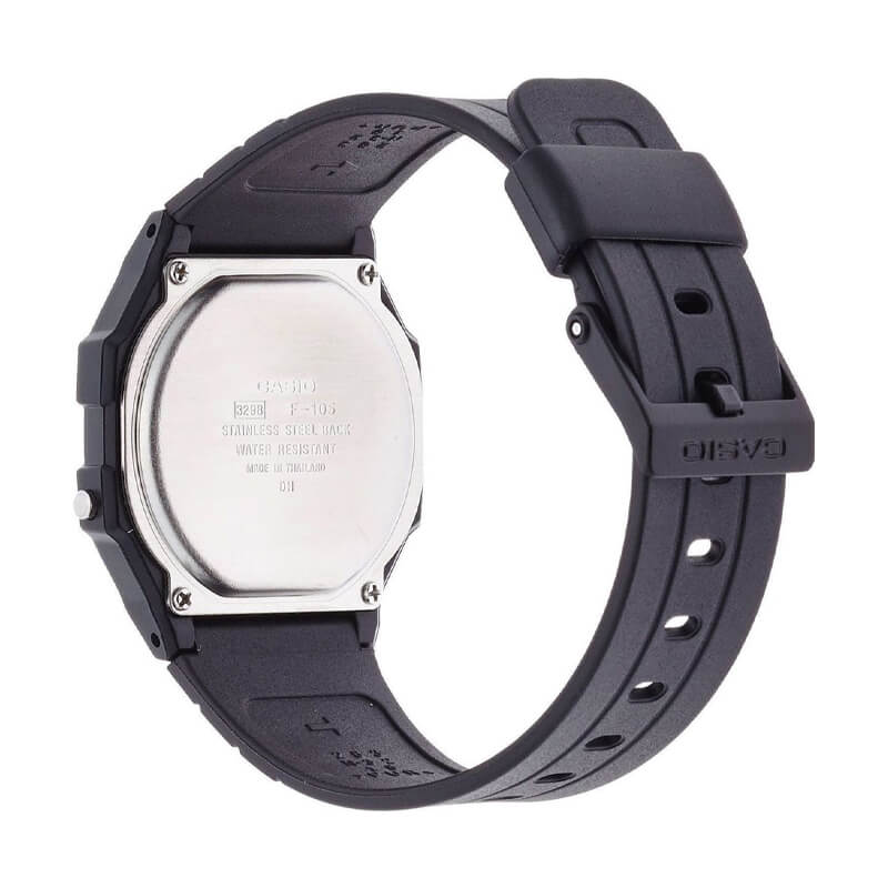 El Casio F-105W-1A es una versión actualizada del icónico F-91W, con luz electroluminiscente para mejor visibilidad en la oscuridad. Su caja de resina negra y pantalla digital clara mantienen el estilo retro y compacto. Incluye cronómetro, alarma diaria, calendario automático y precisión de cuarzo confiable. Ligero y cómodo, es resistente al agua para el uso diario. Ideal para quienes buscan funcionalidad esencial con un diseño probado y duradero.
