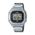 El Casio W-218HD-1AV es un reloj digital funcional con diseño clásico y presencia discreta. Su caja cuadrada de resina negra contrasta con una correa de acero inoxidable tipo oyster, combinando ligereza y durabilidad.