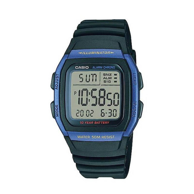 El Casio W-96H-2AV es un reloj digital funcional y resistente, con caja de resina negra y detalles azul marino que le dan un estilo deportivo discreto. Su pantalla amplia permite una lectura clara de hora, fecha, día y segundos.