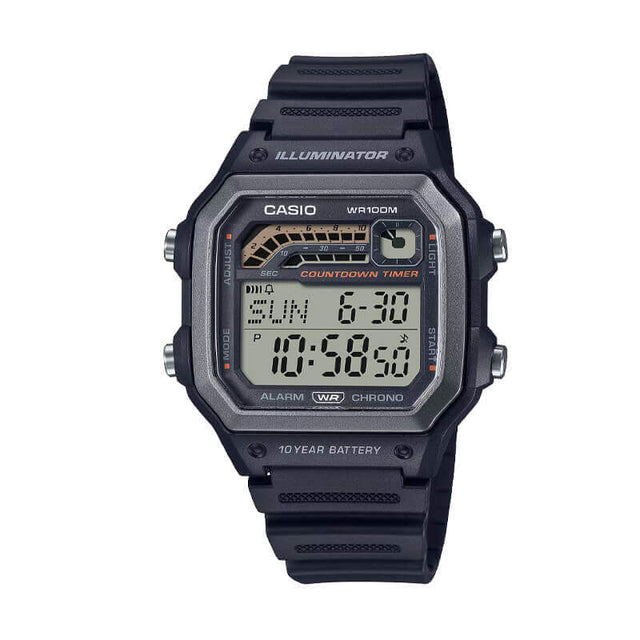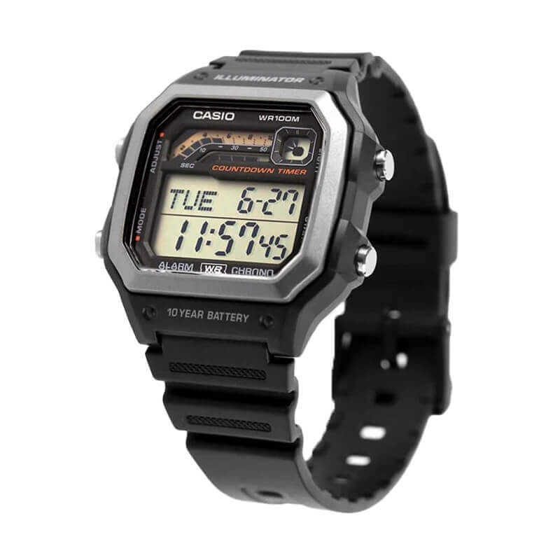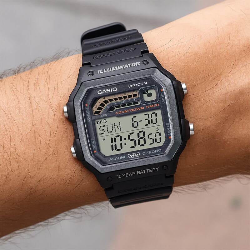 El Casio WS-1600H-1AV luce una caja y correa de resina negra de gran tamaño, con bisel plateado que refuerza su carácter deportivo y robusto. Su pantalla digital amplia y segmentada ofrece lectura clara de la hora, el calendario y demás funciones, con un diseño de estilo outdoor moderno.