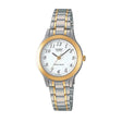 El Casio LTP-1128G-7B presenta una caja de resina cromada dorada con brazalete metálico de acabado brillante, ofreciendo un estilo femenino y distinguido. Su esfera blanca con marcadores dorados y agujas estilizadas realza la elegancia clásica de este diseño compacto y refinado.