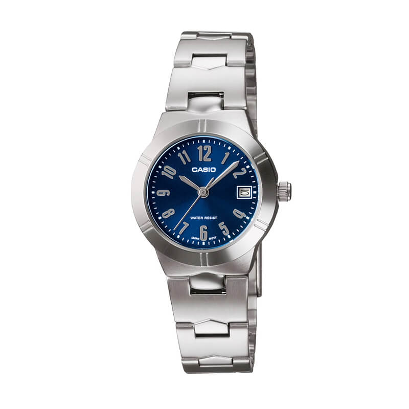 El Casio LTP-1241D-2A2 combina una caja de resina cromada plateada con brazalete de acero inoxidable, logrando un diseño femenino elegante y moderno. Su esfera azul claro incorpora índices metálicos, agujas luminosas y calendario a las 3, ofreciendo un estilo fresco con gran legibilidad.