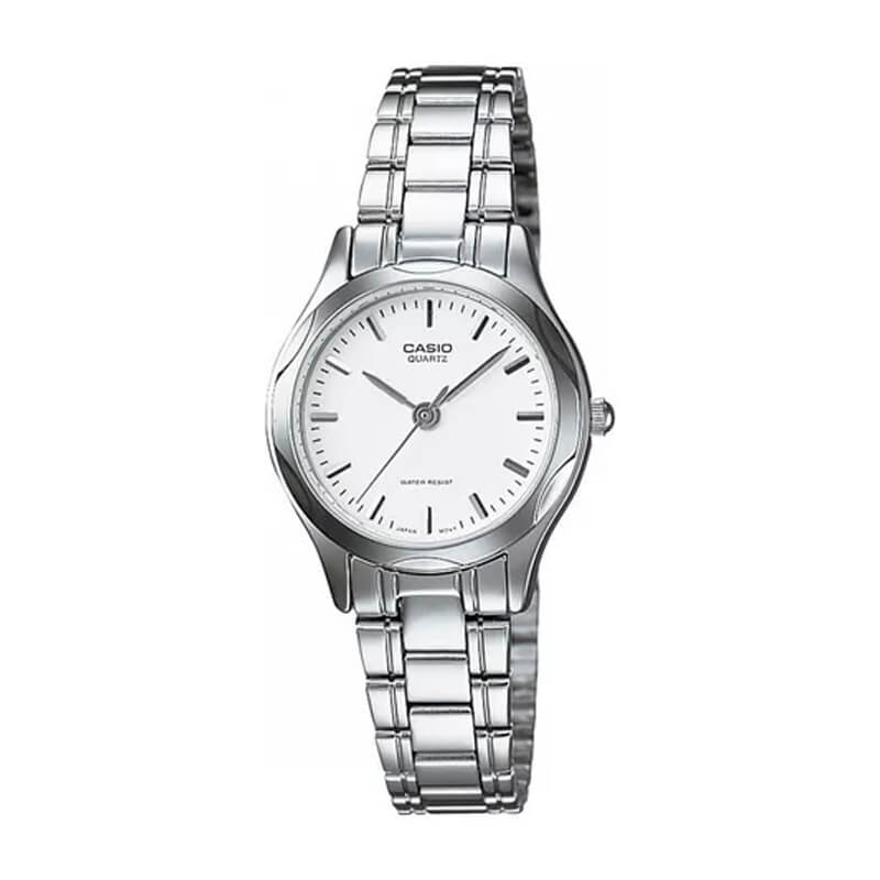 El Casio LTP-1275D-7A combina una caja de resina cromada plateada con brazalete de acero inoxidable, logrando un diseño compacto y elegante. Su esfera blanca con índices metálicos y agujas finas ofrece un estilo sobrio y femenino, pensado para un look clásico y de gran legibilidad.
