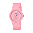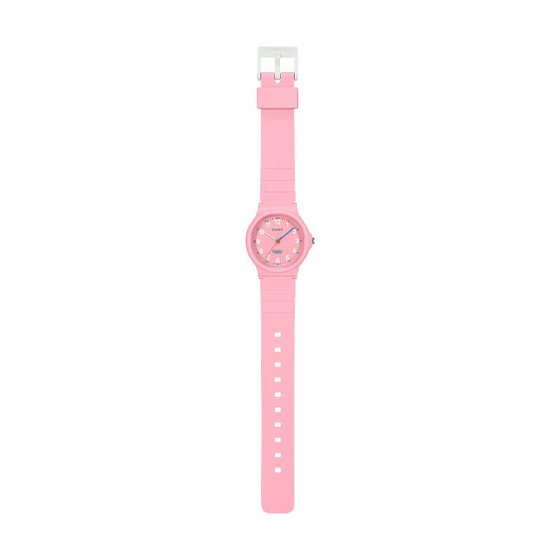 El Casio LQ-24B-4B destaca por su diseño compacto y juvenil, con caja rectangular de resina en color rosado que aporta un toque distintivo y moderno. Su carátula rosada con marcadores blanco y agujas finas mantiene un estilo limpio y fácil de leer. La correa delgada en resina refuerza su ligereza y comodidad en la muñeca.
