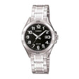 El Casio LTP-1308D-1BV presenta una caja de resina cromada plateada con brazalete de acero inoxidable, logrando un estilo femenino elegante y clásico. Su esfera negra incorpora índices metálicos en blanco, agujas luminiscentes y calendario a las 3, ofreciendo un contraste refinado con gran legibilidad.