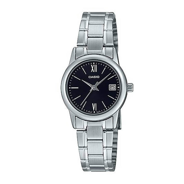 El brillo del acero inoxidable se combina con una esfera negra elegante, donde los números grandes plateados destacan por su legibilidad. Un diseño clásico y femenino que transmite sobriedad y estilo atemporal.
