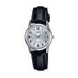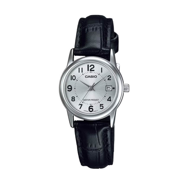 El Casio LTP-V002L-7BU es un reloj análogo femenino de estilo clásico y refinado. Su carátula blanca con números grandes y manecillas negras ofrece una lectura clara y elegante, acompañada por un fechador discreto a las 3.