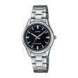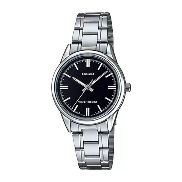El acero plateado de su brazalete se combina con una esfera negra minimalista, marcada por índices metálicos y agujas delgadas que refuerzan su estilo elegante y atemporal. Un diseño femenino clásico que destaca por su sencillez refinada.