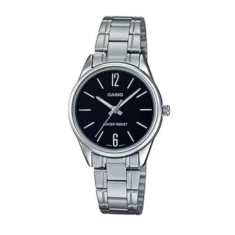El Casio LTP-V005D-1B combina caja de resina cromada plateada con brazalete de acero inoxidable. Su esfera negra con índices blancos aporta un contraste elegante y refinado.