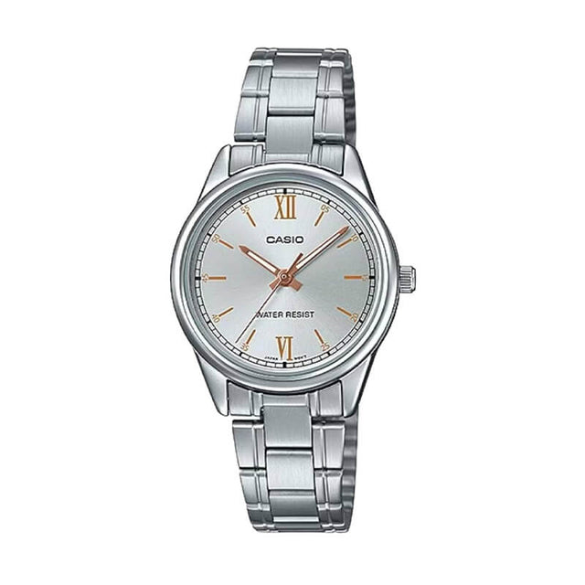 El Casio LTP-V005D-7B2 combina una caja de resina cromada plateada con brazalete metálico de acero inoxidable, logrando un diseño femenino y versátil. Su esfera blanca con números romanos dorados y manecillas estilizadas resalta un estilo clásico y elegante, de lectura clara y refinada presencia.