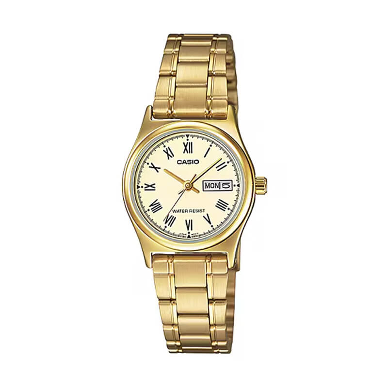 El Casio LTP-V006G-9BUDF presenta una caja de resina cromada con acabado metálico y un brazalete de acero inoxidable en tono dorado que refuerza su estilo elegante y femenino. Su carátula dorada con numerales romanos negros aporta un aire clásico y sofisticado.
