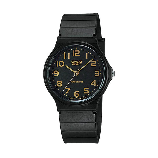 El Casio MQ-24-1B2 es un reloj análogo unisex que combina simplicidad, funcionalidad y un diseño limpio que nunca pasa de moda. Su esfera negra con números dorados bien definidos y manecillas doradas facilita una lectura rápida y clara, ideal para el uso diario.