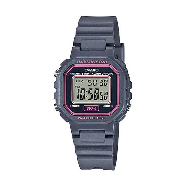 El Casio LA-20WH-8A es un reloj digital que ofrece un diseño sencillo y funcional, ideal para quienes buscan un reloj confiable y accesible. La caja de resina en color gris y la correa a juego proporcionan un look minimalista que se adapta a diversos estilos. La pantalla digital es clara y fácil de leer, con funciones básicas que incluyen hora, minutos, segundos, y una alarma diaria. Es un reloj ligero y duradero, perfecto para quienes buscan un accesorio práctico sin complicaciones.