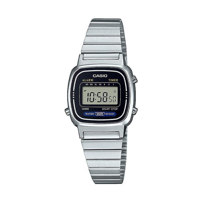 El Casio LA-670WA-1 es un clásico digital en formato compacto, con caja plateada y carátula negra que resalta su estilo retro y atemporal. Su correa de acero inoxidable ajustable ofrece un ajuste cómodo y liviano para el uso diario.