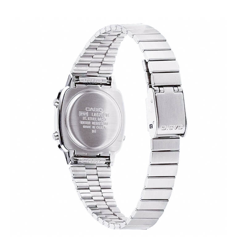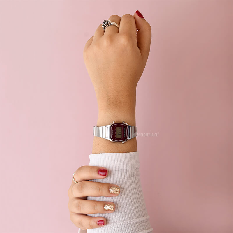 El Casio LA-670WA-4 es un reloj digital femenino de diseño vintage, con caja rectangular cromada y carátula en un delicado tono burdeo que aporta un estilo femenino y nostálgico. Su correa de acero inoxidable ajustable lo hace cómodo y liviano para el uso diario. Incluye cronómetro, alarma, calendario automático y temporizador. Ideal para looks casuales o quienes buscan un accesorio retro con personalidad suave.