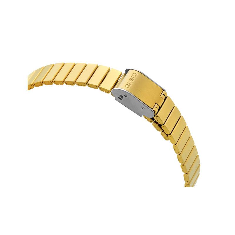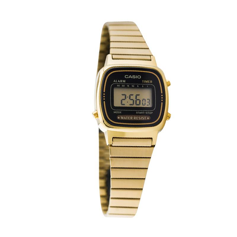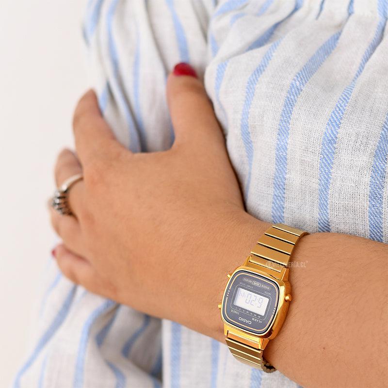 El Casio LA-670WGA-1 es un reloj digital femenino de estilo vintage, con caja rectangular y correa ajustable en acabado dorado brillante. Su carátula negra crea un contraste elegante y atemporal.