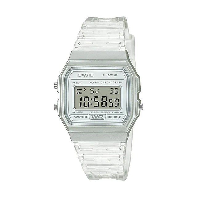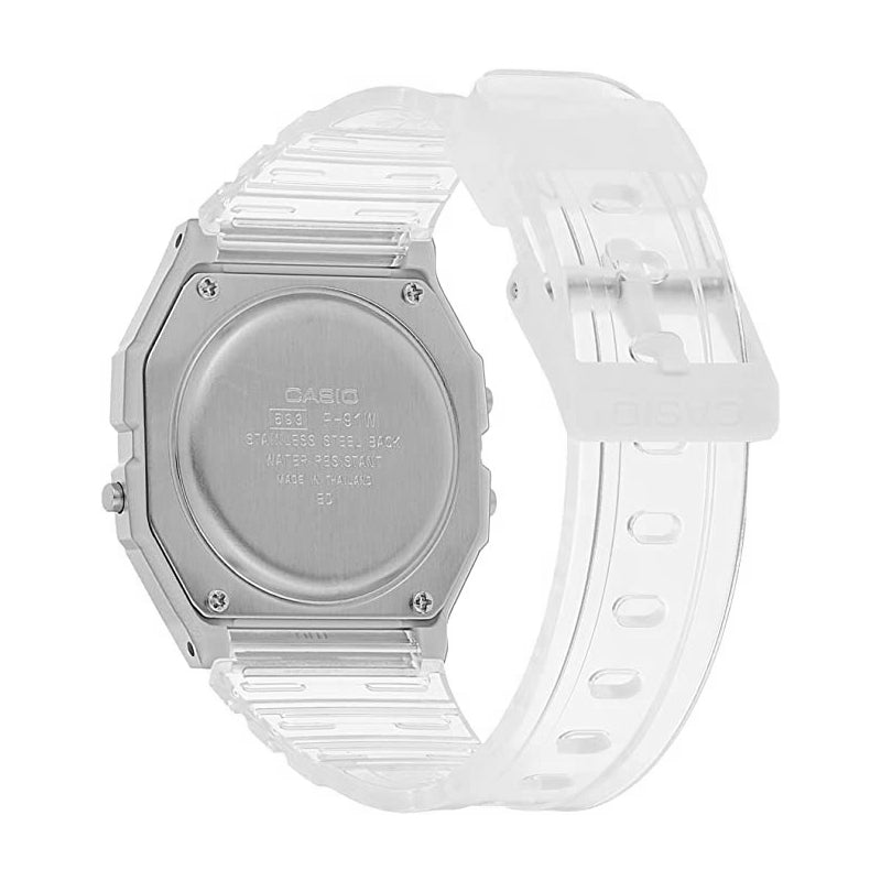 El Casio F-91WS-7D reinterpreta el icónico F-91W con un diseño completamente transparente que lo convierte en una pieza única y llamativa. Este reloj digital unisex conserva todas las funciones clásicas que hicieron famoso al modelo original, ahora con un look contemporáneo que combina con cualquier estilo.