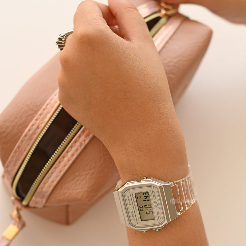 Su caja y correa de resina translúcida le dan un aire ligero y moderno, mientras que su pantalla digital ofrece funciones como cronómetro, alarma, calendario automático y luz lateral para ver la hora en la oscuridad. Además, es resistente a salpicaduras de agua para el uso cotidiano.