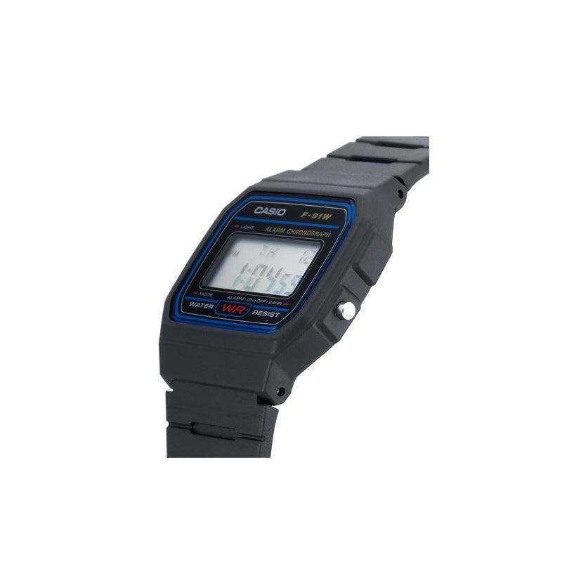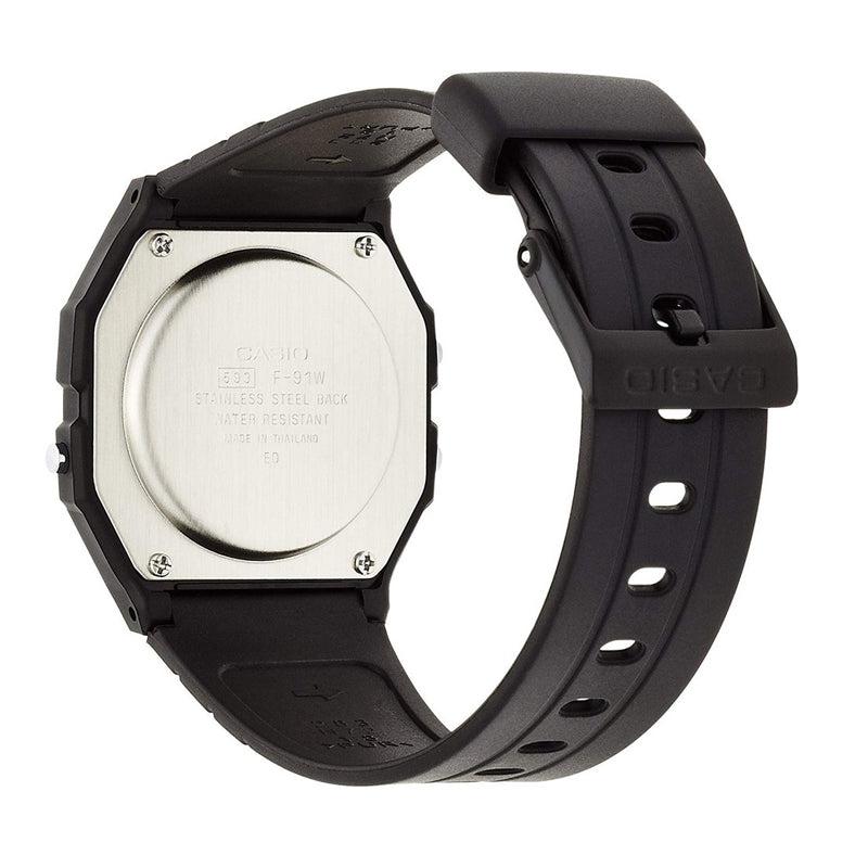 El legendario Casio F-91W-1D es el reloj más vendido del mundo. Su diseño compacto y liviano, con caja de resina negra y pulsera de resina ajustable, lo convierte en un ícono del estilo funcional que ha trascendido generaciones.