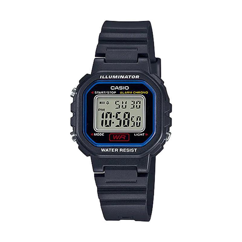 El Casio LA-20WH-1C es un reloj digital compacto con diseño clásico y funcionalidad esencial. Su caja de resina negra y carátula con acentos rosados le da un estilo sutilmente femenino y versátil. Incluye cronómetro, alarma diaria, calendario automático y luz LED. Su correa de resina flexible ofrece comodidad durante todo el día. Resistente al agua para el uso diario, es ideal para quienes buscan un reloj liviano, simple y confiable.