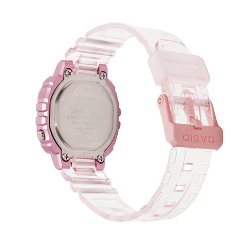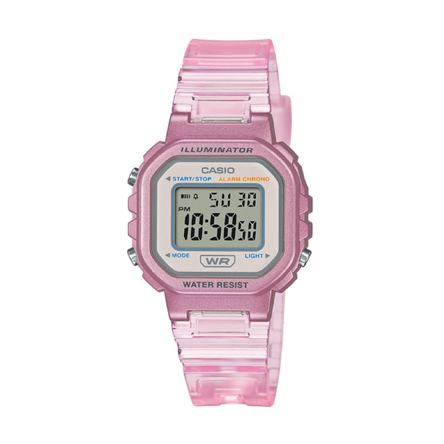 El Casio LA-20WHS-4A es un reloj digital compacto con un diseño juvenil y funcional. Su caja cuadrada de resina rosada mate y correa delgada combinan comodidad con un estilo casual y liviano, ideal para uso diario.