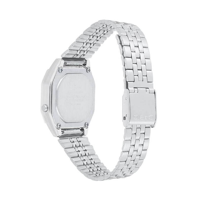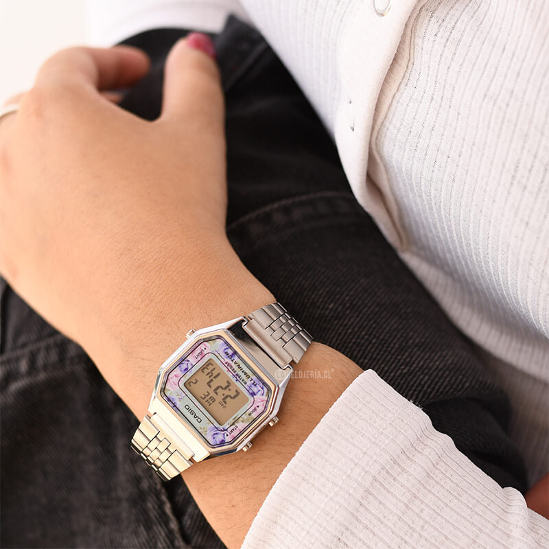 El Casio LA-680WA-2C es un reloj digital femenino de inspiración retro, con caja rectangular cromada y carátula con flores que aporta un toque fresco y juvenil. Su correa de acero inoxidable ajustable lo hace cómodo y ligero para el uso diario. Incluye funciones prácticas como cronómetro, alarma, calendario automático y luz LED. Ideal para complementar looks casuales con un estilo vintage moderno.
