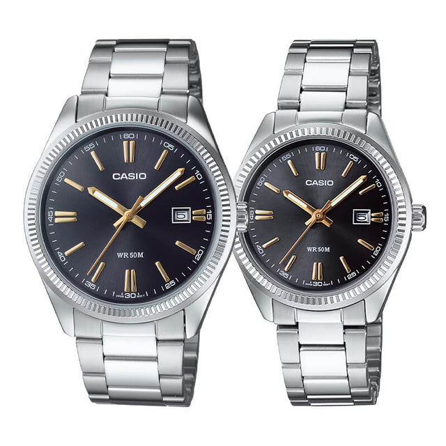 Un Casio para hombre y otro para mujer, ambos con caja y correa de acero inoxidable, esfera negra con detalles dorados y resistencia al agua de hasta 50 m. Precisión japonesa y diseño refinado en un pack ideal para regalar o compartir estilo en pareja.