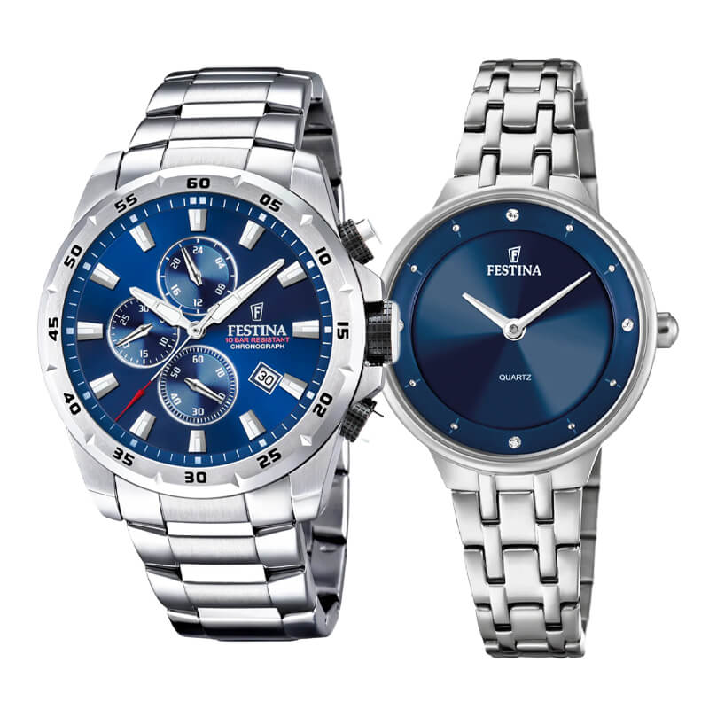 Un Festina para hombre y otro para mujer, ambos con caja y correa de acero inoxidable, esferas sofisticadas y movimiento preciso. Diseño moderno con detalles refinados en un pack perfecto para regalar o disfrutar en pareja con estilo.