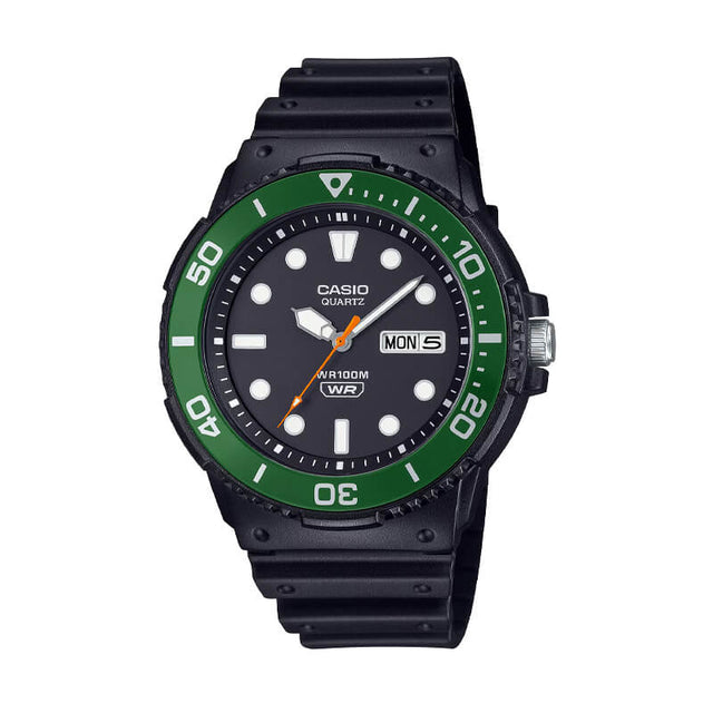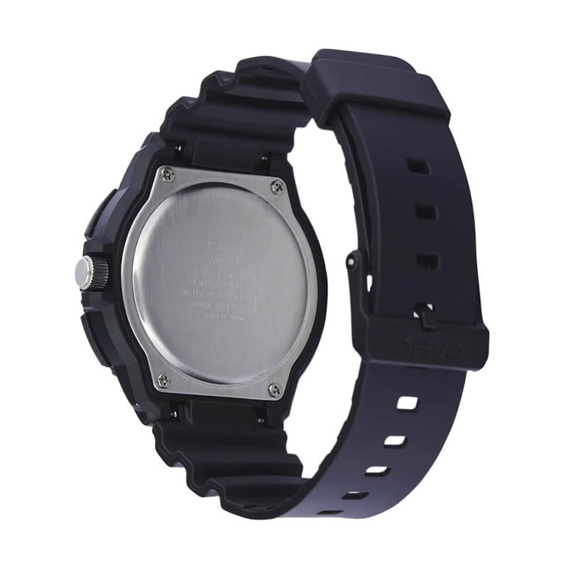 El Casio MRW-230H-1E3VDF presenta una caja de resina negra con bisel giratorio y correa de resina a juego, que le otorgan un estilo deportivo y resistente. Su carátula negra con detalles en verde y marcadores grandes asegura una lectura clara, proyectando un diseño robusto y moderno.