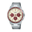 El Casio MTP-1374D-5A2V combina una elegante esfera crema con subesferas y bisel en tono burdeo metálico, logrando un contraste sofisticado y original. Sus funciones de día, fecha y formato 24 horas están distribuidas de forma equilibrada, aportando practicidad sin recargar el diseño.