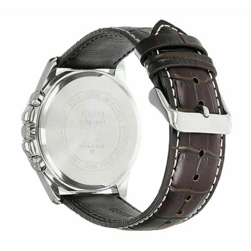 El Casio MTP-1374L-7A1VD combina una caja de resina cromada con acabado metálico y una correa de cuero café texturizado que aporta elegancia y comodidad. Su carátula champange con subesferas en burdeo y detalles plateados le da un estilo moderno y equilibrado, manteniendo la sobriedad clásica.